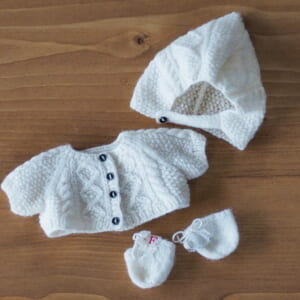 「アラン模様のカーデととんがり帽子のセット」アラン模様が可愛いカーデと帽子のセットです。
