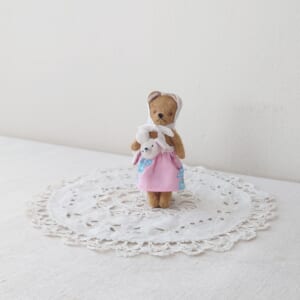 「18cmぬいぐるみ くま」とっても手触りやわらかな、くまのぬいぐるみです。ひよことさくらんぼとお花の刺繍のワンピースを着ています。