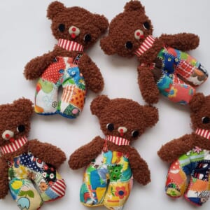 「くまのパッチワークちゃん」カワイイハギレをたくさんパッチワークしたおパンツをはいたくまさん。一点物のおパンツをはいています!