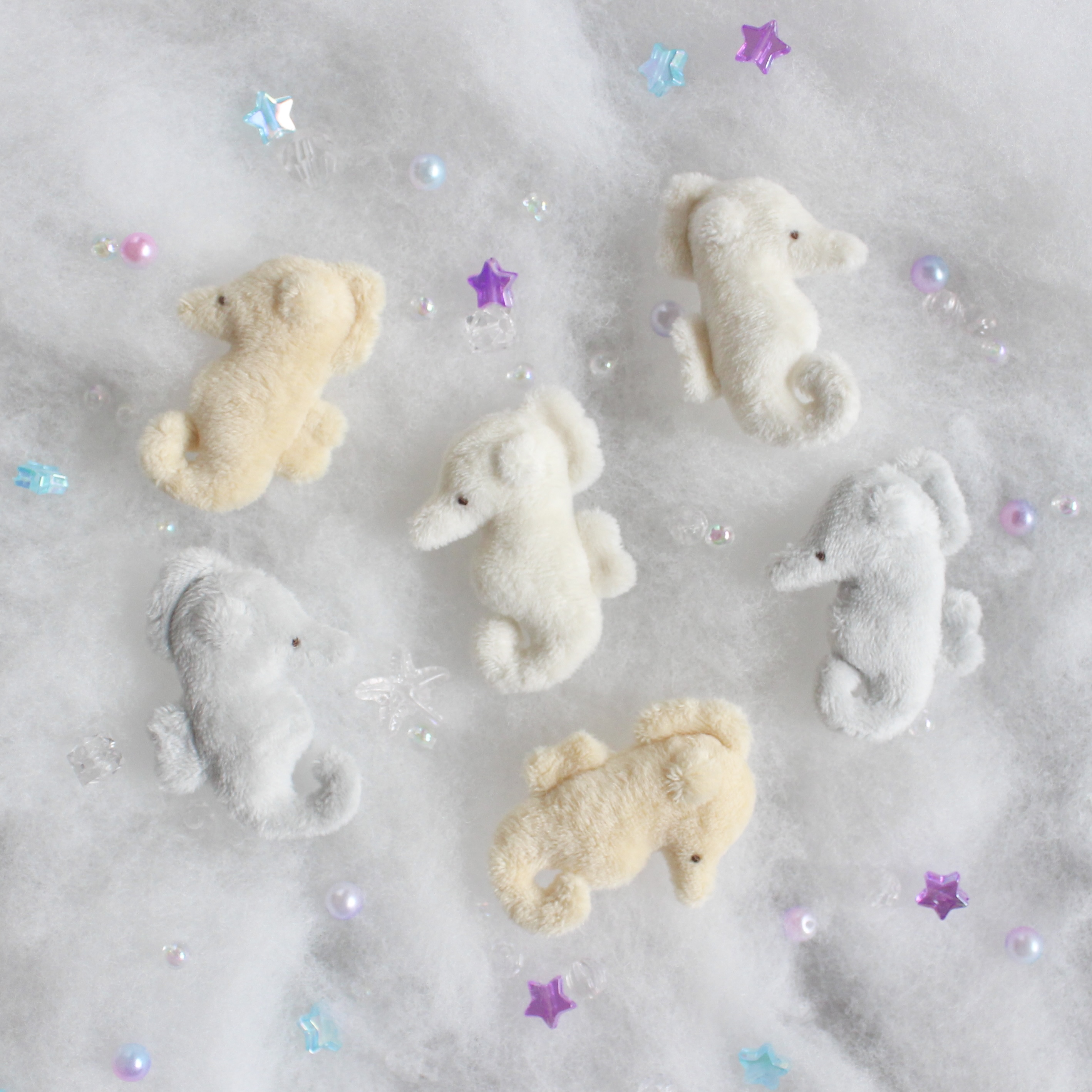 この子は、2024年頃に海の生き物のぬいぐるみを作ろうと考えていた時、ちょうど辰年だったことから「タツノオトシゴを作ったら面白いのでは?」と思い立って誕生しました。実際のタツノオトシゴも小さくて可愛らしいですが、「手のひらに収まるくらいのサイズにしたら、もっと可愛いのでは?」という発想から、この形になりました。実物のタツノオトシゴのように、バランスが取れれば尾の部分で物につかまることもできます!