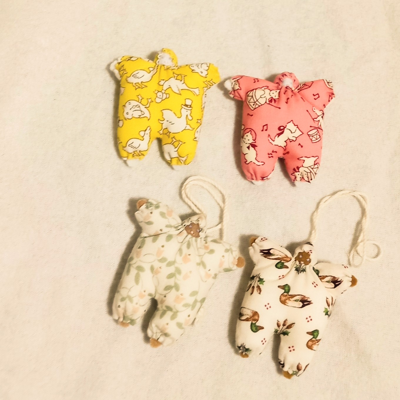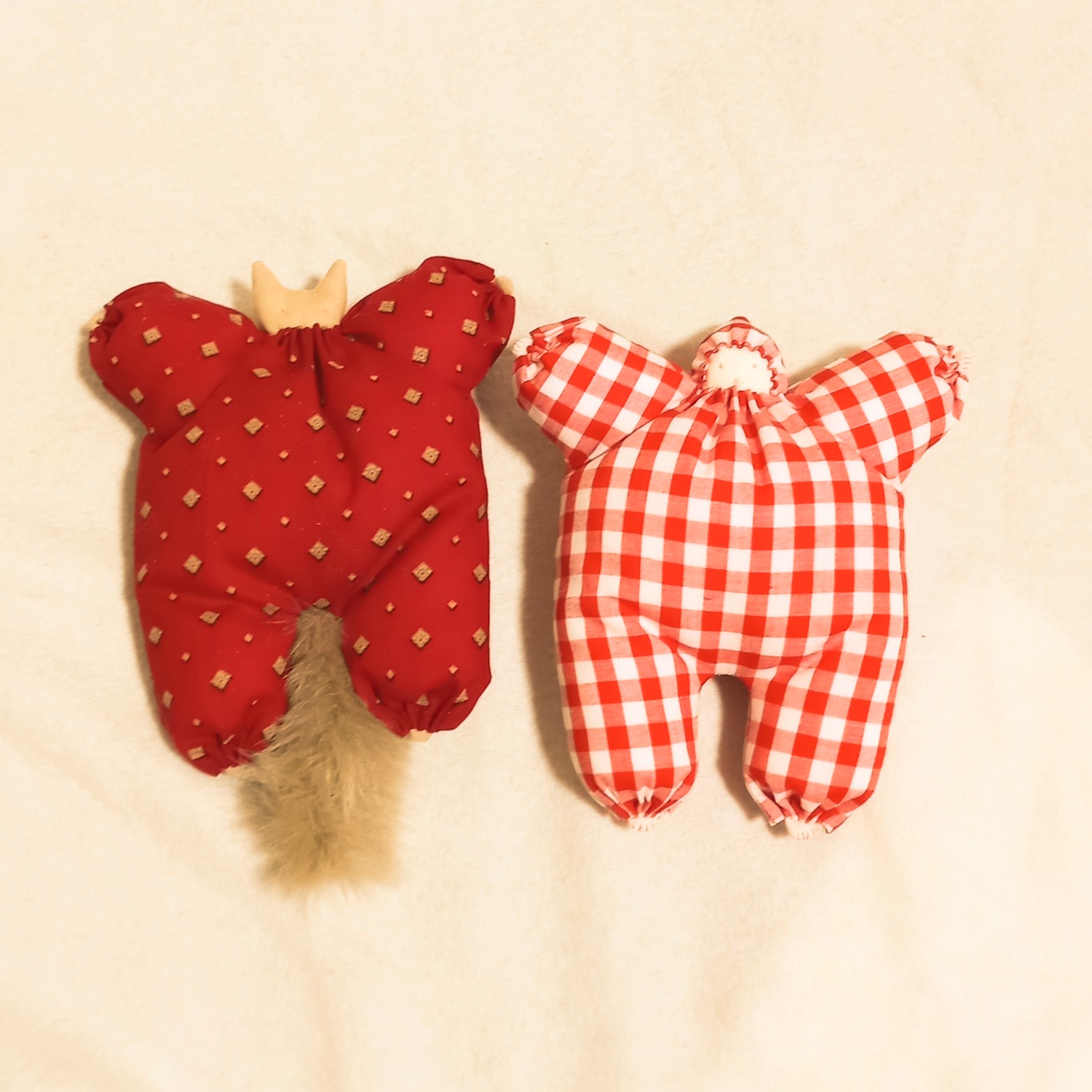 かわいい柄のお洋服を着た赤ちゃん人形と、ふにゃふにゃ手触りのネコちゃんぬいぐるみ。赤ちゃん人形はブローチとお守りタイプもございます!