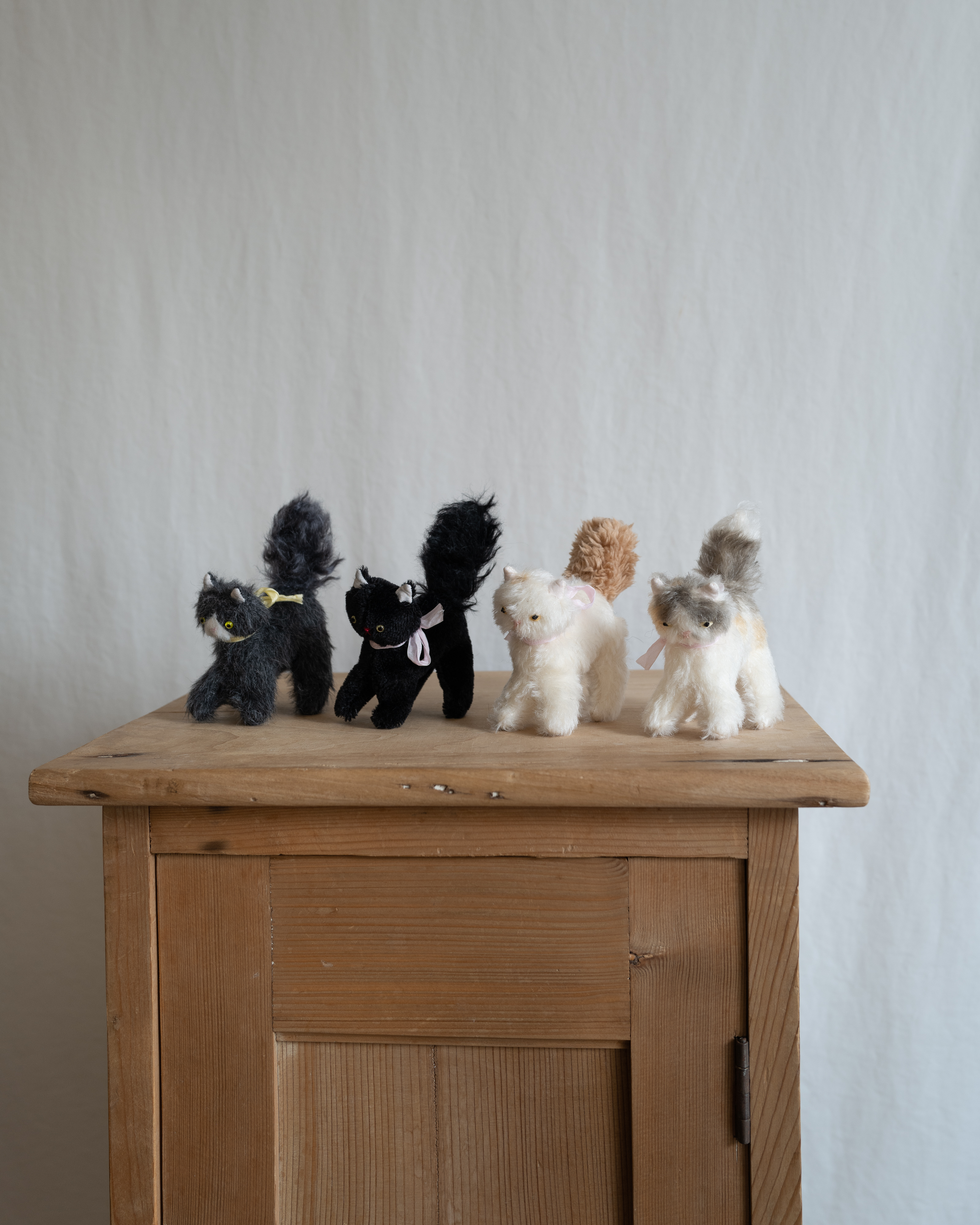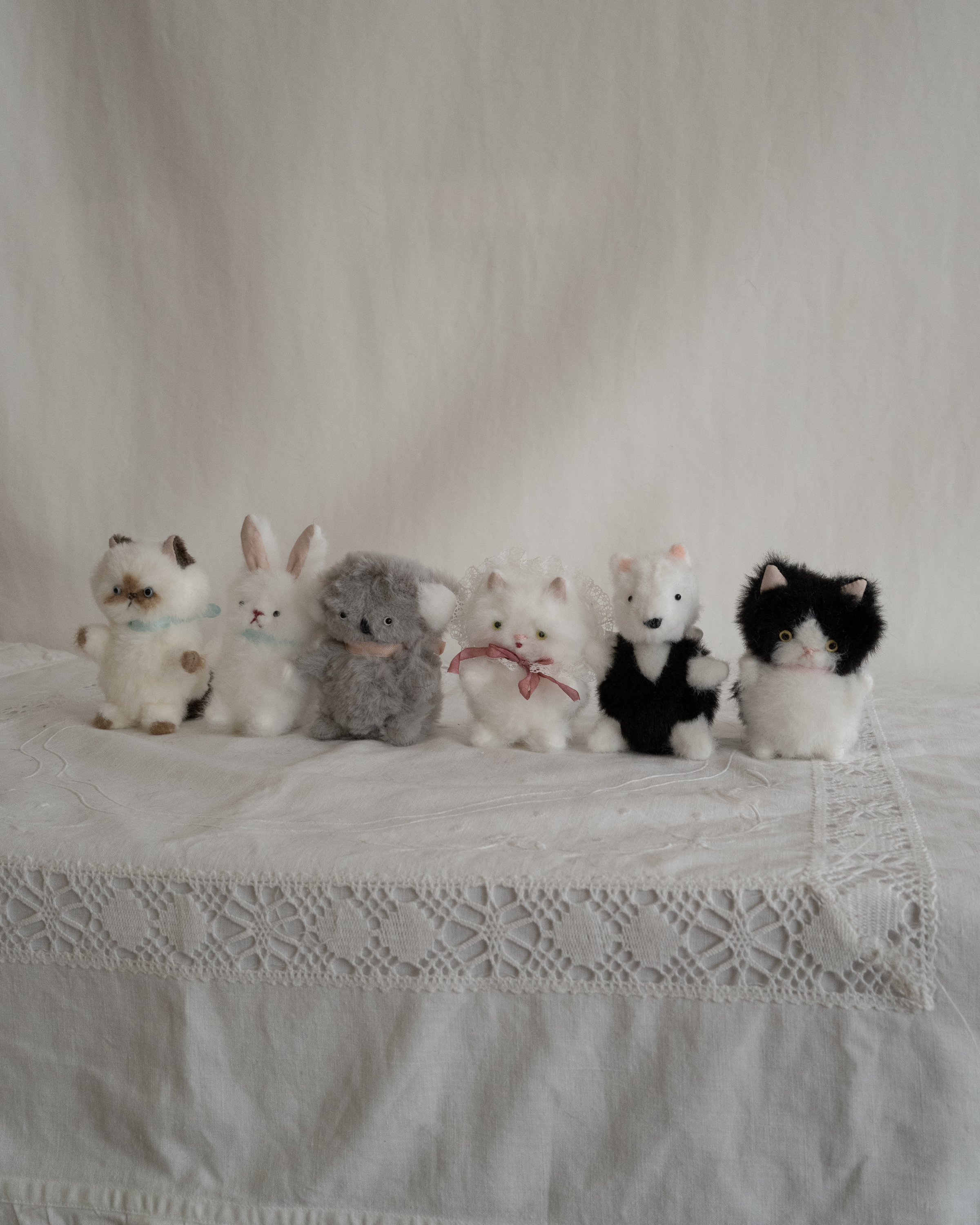 2022年に飼い猫の「さてちゃん」の分身を大量に作り始めたことをきっかけに、ぬいぐるみ制作を開始した「さて」。そのときの気分で自由に作る既製品と、お客さまのご要望に沿ったオーダーメイドの二軸で活動を行なっています。立っている人形タイプは洋服などを着せることができ、おすわりタイプは本物の猫に近い姿を楽しむことができます。小さいぬいぐるみや、まんまるな「おでぶちゃん」をお持ちしてくれますよ。